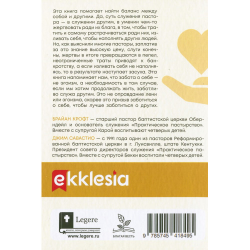 Эта книга помогает найти баланс между собой и другими. Да, суть служения пастора—в служении другим, в умении чем-то жертвовать ради их блага, в том, чтобы тратить и самому растрачиваться ради них, изливать себя, чтобы наполнять других людей. Но, как выяснили многие пасторы, заплатив за это знание высокую цену, слуги конечны, жертвы в итоге превращаются в пепел, неограниченные траты приводят к банкротству, а если изливать себя не наполняясь, то в результате наступает засуха. Эта книга напоминает нам, что забота о себе — не эгоизм, а необходимость в том случае, если мы хотим продолжать жить, заботливо служа другим. Это не оправдание лени или эгоизма, скорее это призыв заботиться о себе, чтобы лучше заботиться о других.