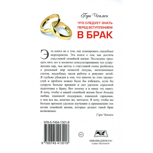 Эта книга не о том, как планировать свадебные мероприятия. Эта книга о том, как достичь счастливой семейной жизни. Последние тридцать пять лет автор посвятил консультированию тех супружеских пар, чьи мечты о счастливой семье, разбились о реальный мир немытой посуды, неоплаченных счетов, неудобных часов работы и ревущих детей. Гэри Чепмен глубоко убежден в том, что многих из этих трудностей и проблем можно было бы избежать, если бы супруги больше времени и сил уделили серьезной подготовке к браку. Вот почему и написана эта книга.